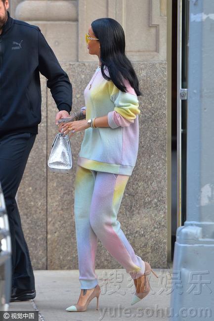 蕾哈娜一身复活节套装现身 与友人告别心情靓