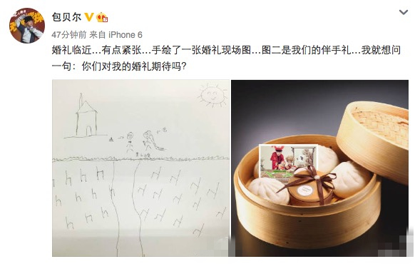 昨日,包贝尔通过微博发布了一张手绘版婚礼现场图和伴手礼的图片,并调侃道:“婚礼临近…有点紧张…手绘了一张婚礼现场图…图二是我们的伴手礼…我就想问一句:你们对我的婚礼期待吗?”,以此来抒发自己的紧张情绪。图中两人婚礼的伴手礼竟然变成一屉包子,让网友忍俊不禁,更调侃包贝尔“不会婚礼真的用包子来当伴手礼吧”,而包贝尔手绘的现场图则走起了简约随性风,毫无画技可言的风格,也让网友吐槽包贝尔的画技“不堪入目”,“不会是让饺子画的吧”。尽管是恶搞图,但是也不难看出,包贝尔包文婧的婚礼将会以喜剧风格为主题,两人将以何种形式完成这场婚礼也让众多网友十分期待。