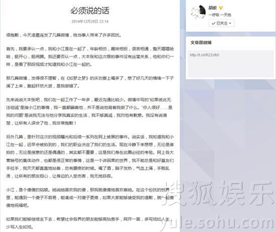 胡歌2014年底发微博承认恋情。