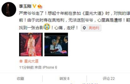 今日一早,李玉刚在微博发文称因为自己身在国外,不能送别严肃,内心深感遗憾。回想起十年前在《星光大道》上严肃对自己的谆谆教诲,画面还犹如就在眼前……