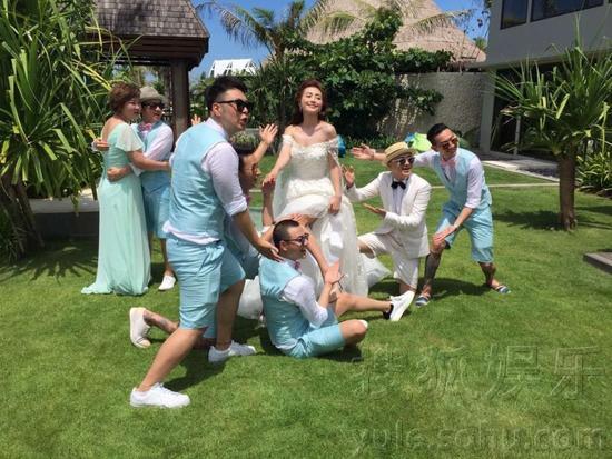 包文婧女王范儿被伴郎团围绕。
