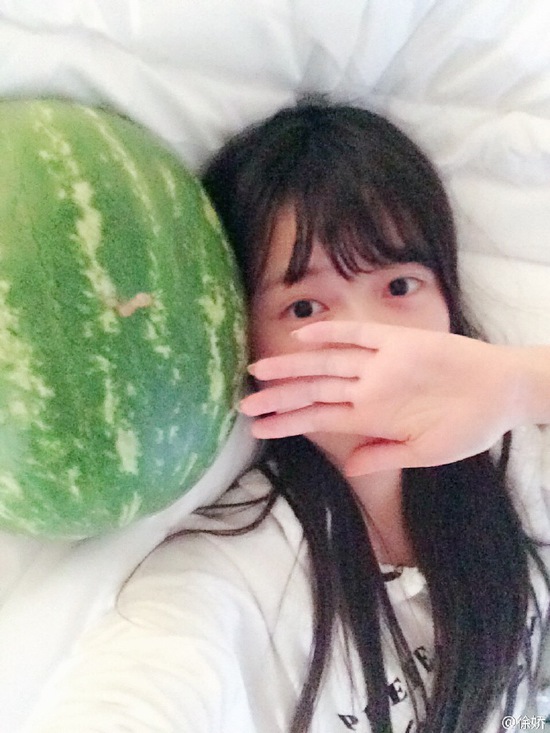 6月28日晚,徐娇微博晒出Cos动漫人物星空凛的美照,穿着吊带清凉装,摇着扇子,啃着西瓜,甚是清凉自在。