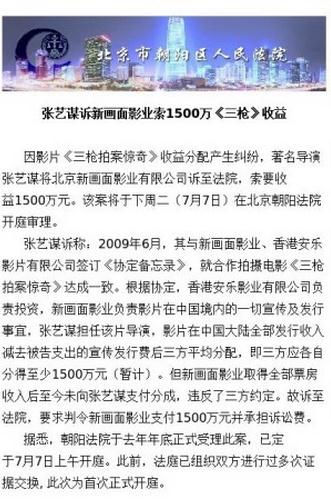 北京市朝阳区法院7月2日披露,导演张艺谋因影片《三枪拍案惊奇》收益分配问题,将新画面影业公司诉至法院,索要该片收益1500万元人民币。