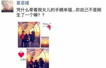 章子怡在微博晒出与汪峰及继女小苹果的牵手照,幸福之情溢于言表。15日下午,葛荟婕转发章子怡微博,称看女儿开心笑着会感激感谢,但一句“我女儿很单纯,别去诱导欺骗她”疑似话里有话。