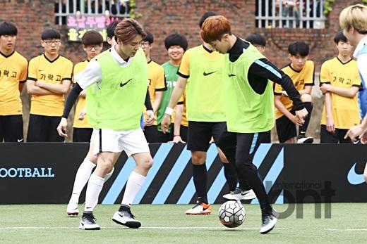 搜狐韩娱讯 21日下午,某全球著名体育运动品牌在首尔松坡洞可乐高等学校举行迷你足球比赛,男子组合JYJ成员金俊秀、BEAST成员尹斗俊和李起光作为明星球员现身。bnt新闻/供稿 吴婧怡/文 黄址恩/图