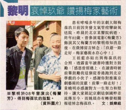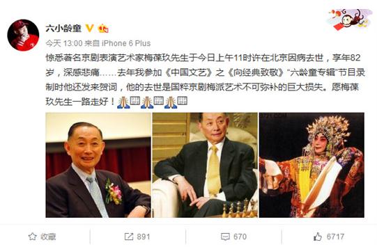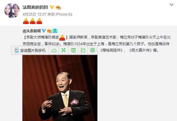 曾参演电影《梅兰芳》饰演其父梅兰芳的黎明得知消息后,在微博留言悼念:“玖爷一路走好,梅家艺术永存心中!”