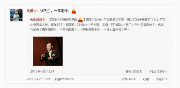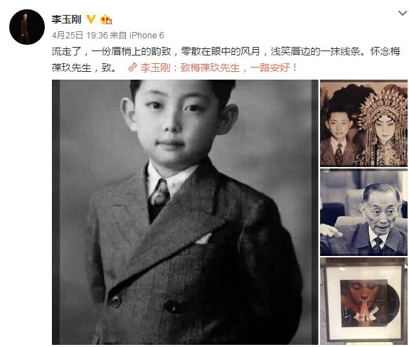 艺人李玉刚在微博缅怀梅葆玖先生。李玉刚写道:流走了,一份眉梢上的韵致,零散在眼中的风月,浅笑唇边的一抹线条。怀念梅葆玖先生!