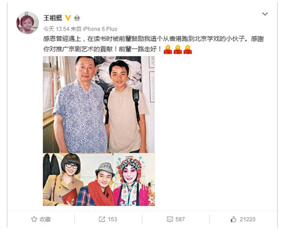 王祖蓝唏嘘不已道:“感恩曾经相遇,感谢前辈的鼓励,感谢您对推广京剧艺术的贡献,前辈一路走好!”
