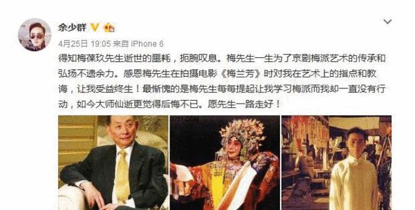 曾扮演梅兰芳的余少群通过微博缅怀梅葆玖先生,并发出和梅兰芳之子梅葆玖合影,并缅怀老先生,称:“得知梅葆玖先生逝世的噩耗,扼腕叹息。梅先生一生为了京剧梅派艺术的传承和弘扬不遗余力。感恩梅先生在拍摄电影《梅兰芳》时对我在艺术上的指点和教诲,让我受益终生!最惭愧的是梅先生每每提起让我学习梅派而我却一直没有行动,如今大师仙逝更觉得后悔不已。愿先生一路走好!”