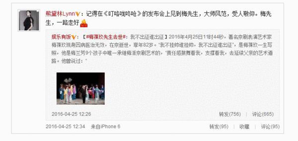 熊黛林和刘雨欣也发微博怀念在《叮咯咙咚呛》节目录制中亲临现场指导的梅先生:“非常敬仰,梅老先生大家风范!”姚晨、冯远征、哈文、刘涛等也纷纷发布微博悼念梅先生,祝愿前辈一路走好。