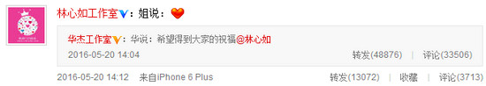 今日(5月20日),霍建华工作室官方微博发布一条消息,称“华说:希望得到大家的祝福。”并艾特了林心如。随后,林心如工作室官方微博转发微博,发表红心默认。(据中新网)