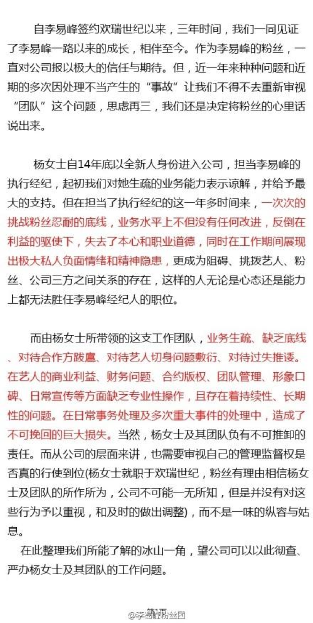 人民网北京6月19日电 (记者吴亚雄)6月18日晚间,名为“李易峰粉丝团”的微博博主发出长文,要求欢瑞开除李易峰经纪人及其团队。文中认为经纪人团队“业务生疏、缺乏底线、对待合作方跋扈、对待艺人切身问题敷衍、对待过失推诿,经纪人在处理自己相关负面时高速有效,而面对艺人的一些负面新闻、话题时却总是不管不顾拖延推诿毫无作为。”