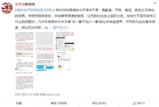 “李易峰粉丝团”的微博认为经纪人的团队置粉丝、李易峰的利益于不顾,这一系列行为是“一场目的不明的极具诈欺意味的掠夺”。
