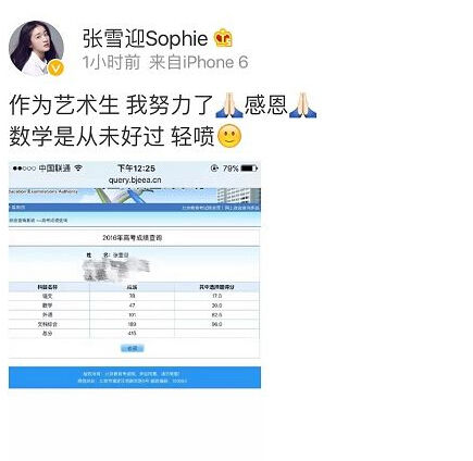 随后张雪迎也在微博发布成绩并配文:“作为艺考生,我努力了,感恩,数学从未好过,轻喷。”在高考放榜时还不忘自黑,调节气氛,给了粉丝安心,搞怪本色尽显。