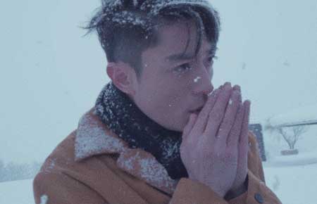 他站在飘着细雪的场景中,一边哈气一边缓慢看向镜头,雪花沾在他长长的睫毛上,深情眼神瞬间电翻不少网友。