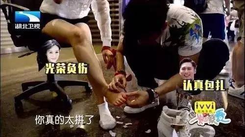 钟丽缇脚破了,直接给钟丽缇脱鞋脱袜,贴创可贴。