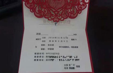曝钟丽缇张伦硕结婚请柬 疑在临沂办婚礼