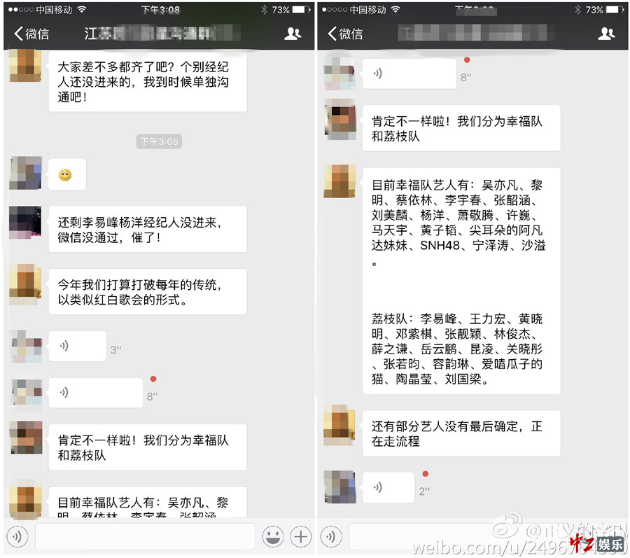 中工娱乐11月24日报道 还没到12月,就已经感受到了跨年的气氛。年关岁末,跨年演唱会就将在各大省级卫视上演,江苏卫视日前率先宣布加入2017跨年狂欢夜,今年的荔枝跨年将以“聚17更happy”为主题。众所周知,演出阵容绝对是打好跨年战的首要保障。日前,一份江苏卫视工作人员的内部对话截图在网上纷纷流传,对话中疑似曝光了不少邀请到的明星,其中,最值得关注的是,已经连续八年在湖南卫视跨年,并成为零点专业户的李宇春将首次来江苏卫视跨年。此外,2017荔枝跨年将采用“红白歌会”的对战模式,荔枝队VS幸福队众多大牌明星均在列。