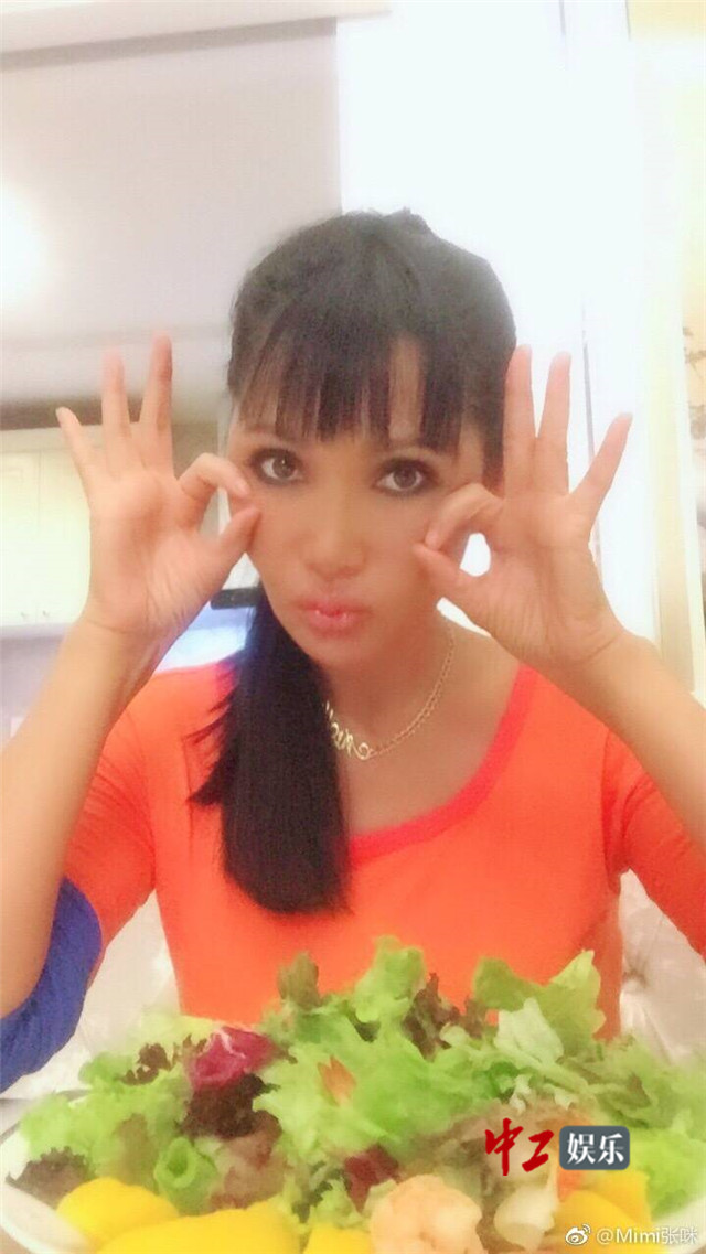 昨日张咪深夜在微博突然一改往日性感做派,大胆晒出素颜自拍照片,照片中张咪身着橘色居家服和一条迷彩牛仔裤,在自拍照中张咪还晒出自己制作的两道简单的西餐:蔬菜沙拉与意面。