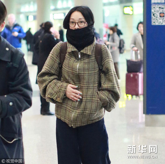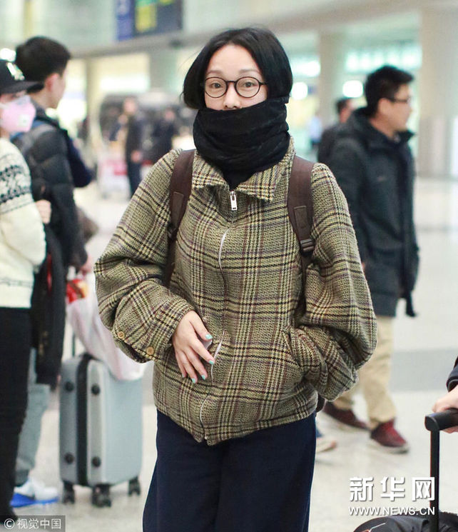 周迅素颜现身机场,黑色围巾包裹 一身朴素打扮。