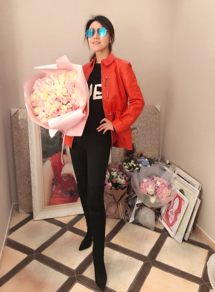 照片中,闫妮身穿红色短夹克内衬黑色T恤,黑色紧身裤搭配黑色短靴更显美腿修长,手捧鲜花笑容灿烂。