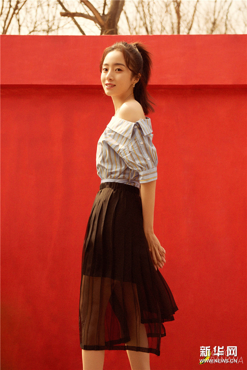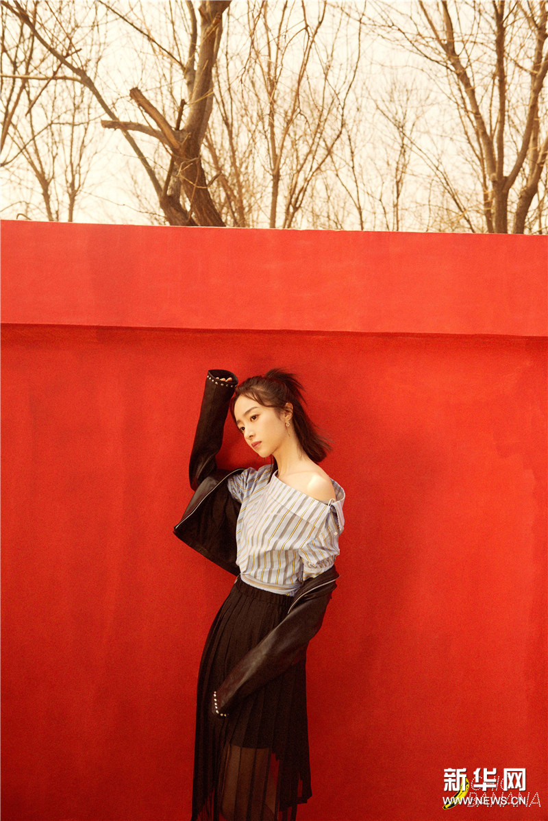 胡冰卿身穿一字肩条纹上衣搭配黑色小皮衣外套,黑色透视长裙搭配条纹高跟鞋帅气满分,在红墙背景衬托下的胡冰卿少女感十足。