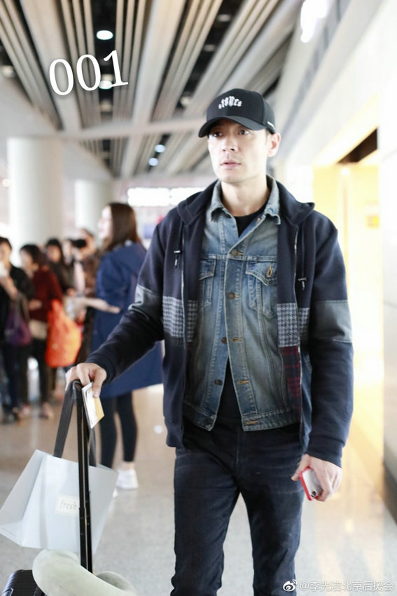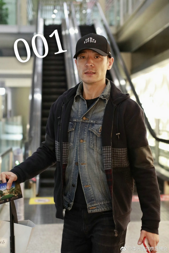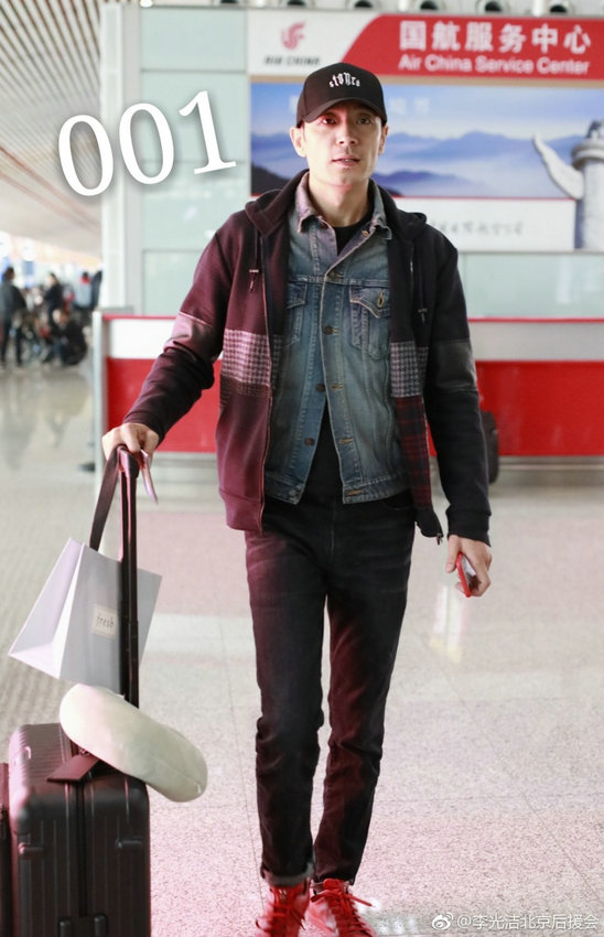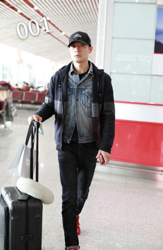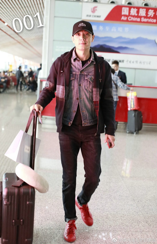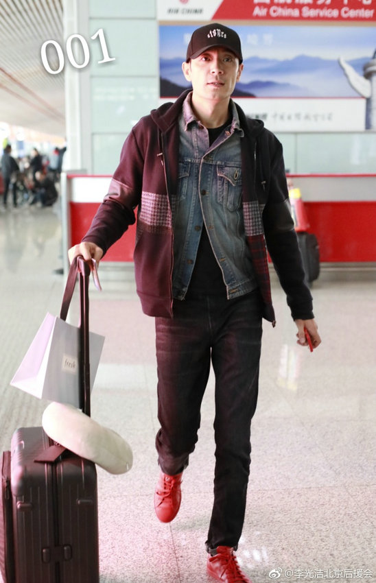 近日,型男李光洁独自推行李现身机场被拍,脚穿大红色皮鞋成亮点、手机壳也是红色,喜气十足。照片中李光洁刮干净了胡子显年轻不少,身穿牛仔外套,外搭休闲帽衫,头戴黑色棒球帽,对镜头面露微笑,看似心情大好。