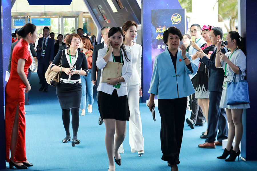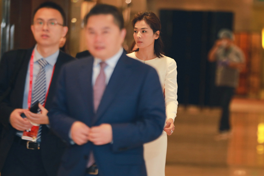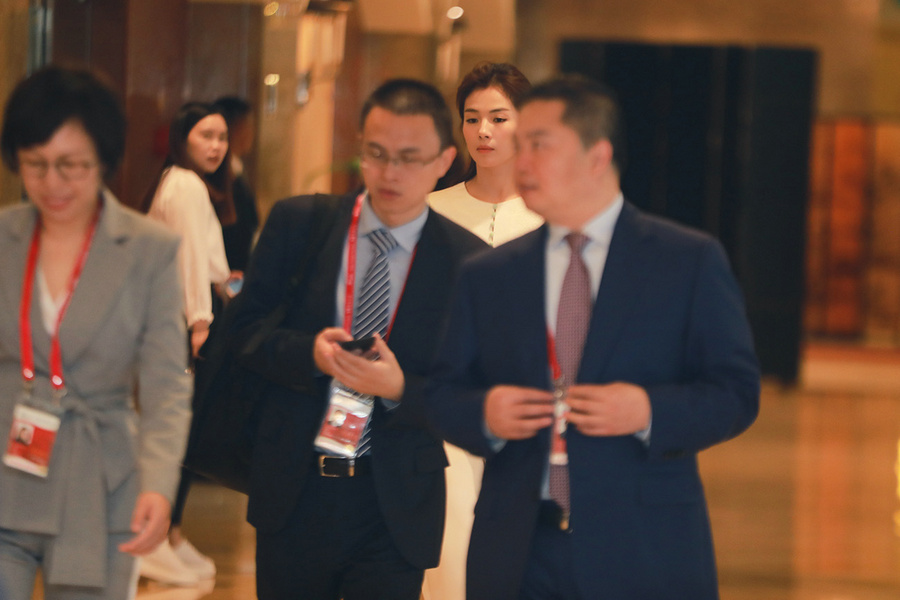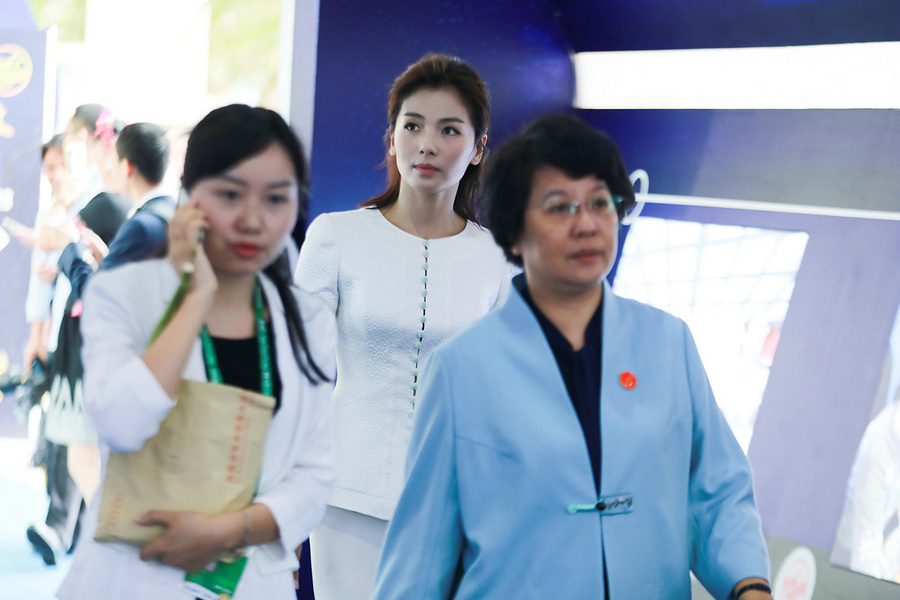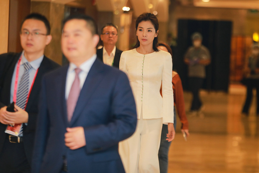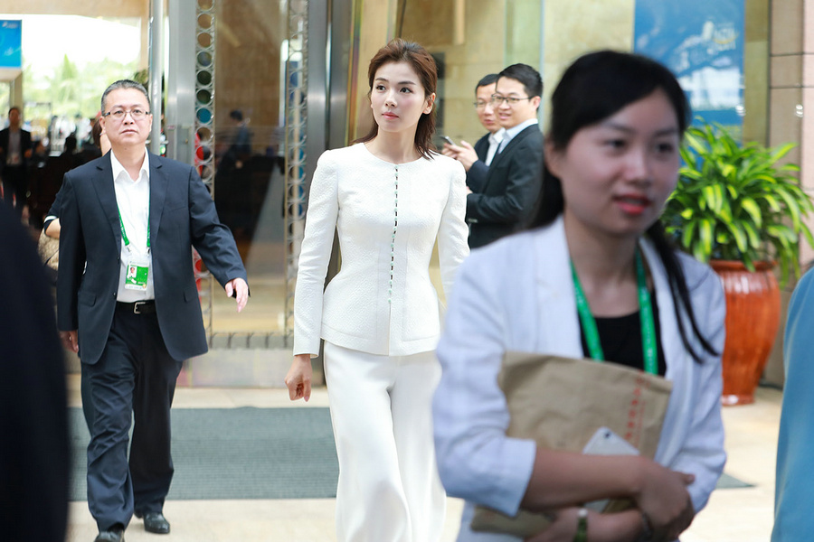 2018年4月10日,三亚,博鳌亚洲论坛现场,刘涛一身白色套装亮相,步伐稳健,时而和与会人员沟通笑容满面,气质出众。