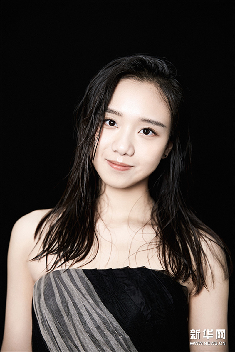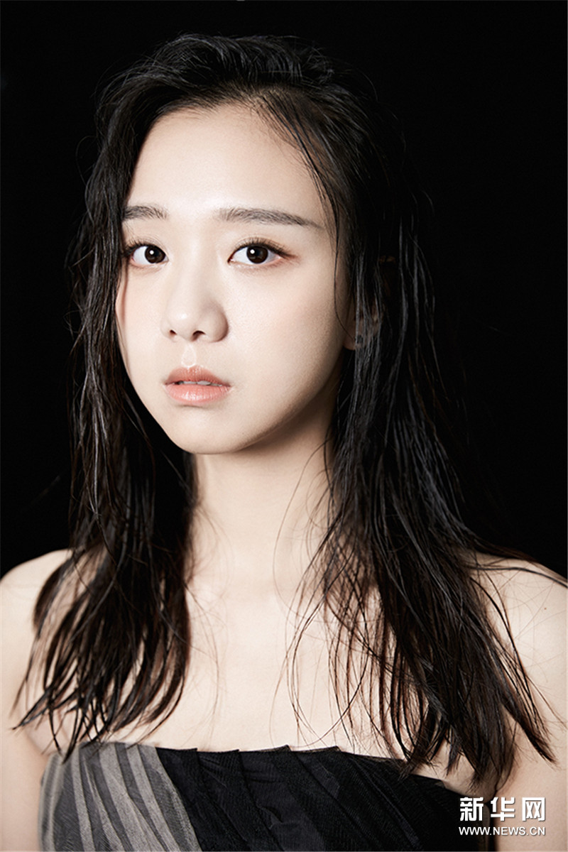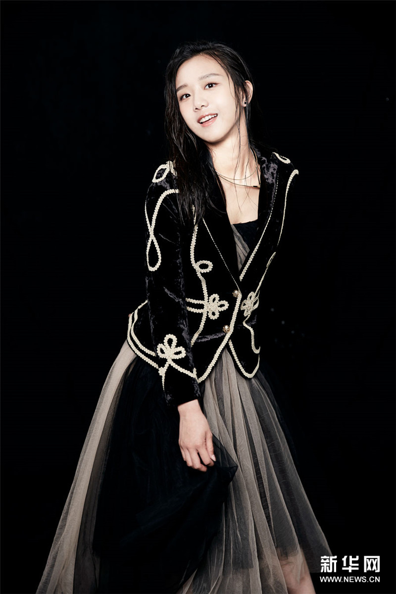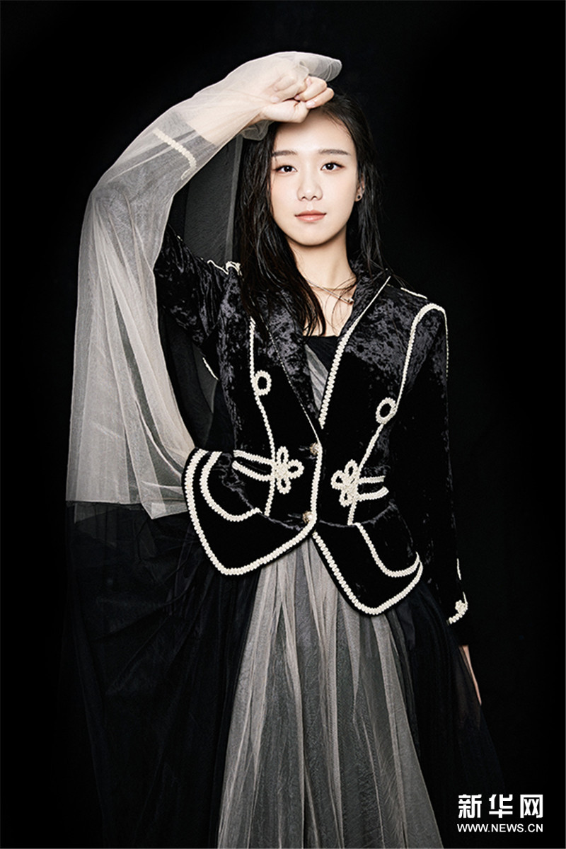 写真中,曾淇身着黑白复古套装,举手投足间颇具青春魅力。