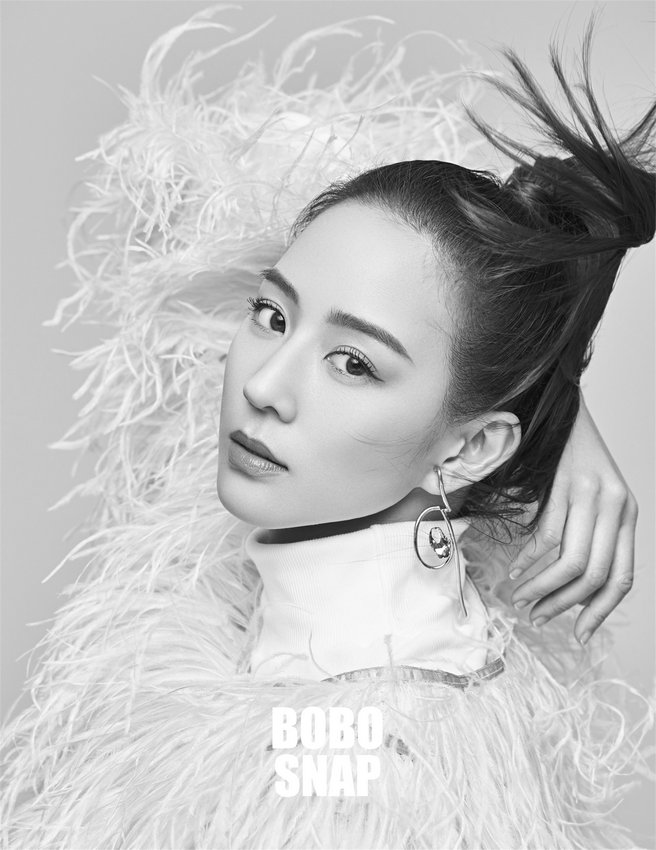 写真中,曾淇身着黑白复古套装,举手投足间颇具青春魅力。