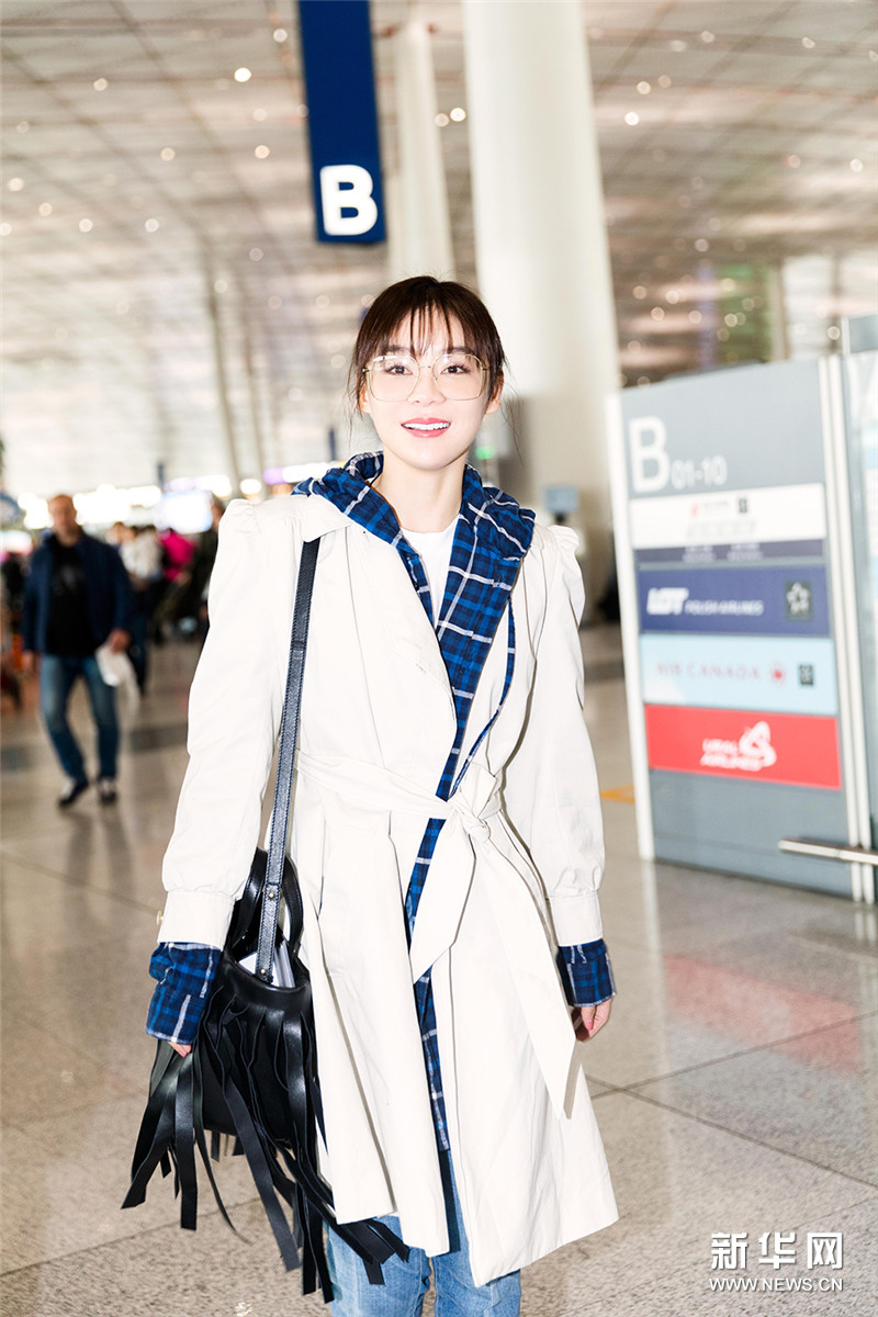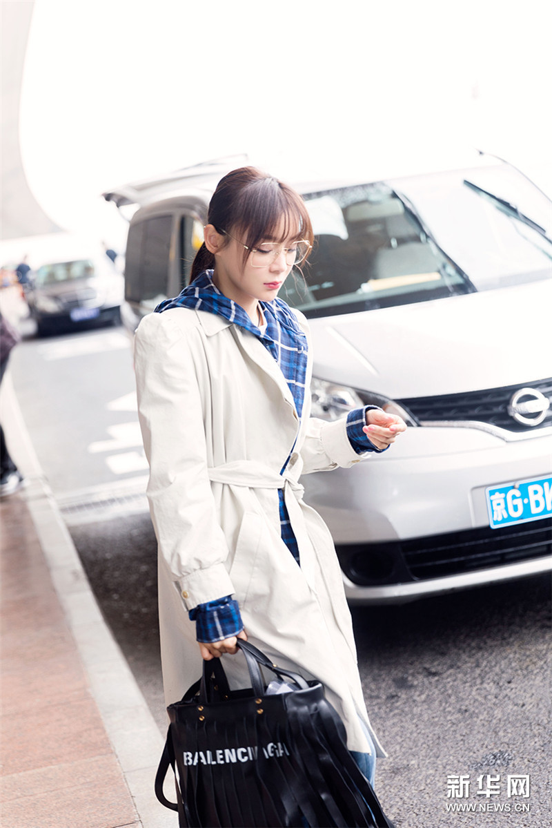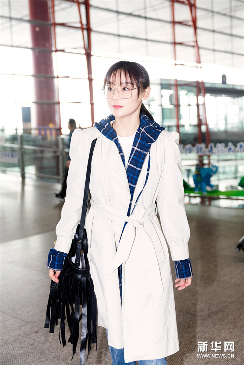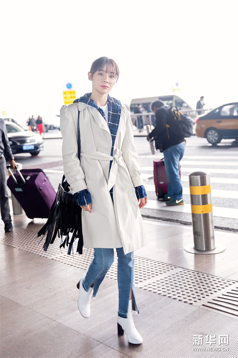 近日,袁姗姗现身机场,蓝格衬衣外搭米色风衣,脚踩小白靴,整体造型时髦感十足。