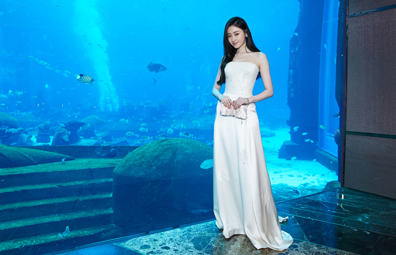 照片中,张天爱身着白色礼服,在迷幻风的蓝色灯光下,呈现出一种朦胧柔美的梦幻观感,即美艳又灵动。