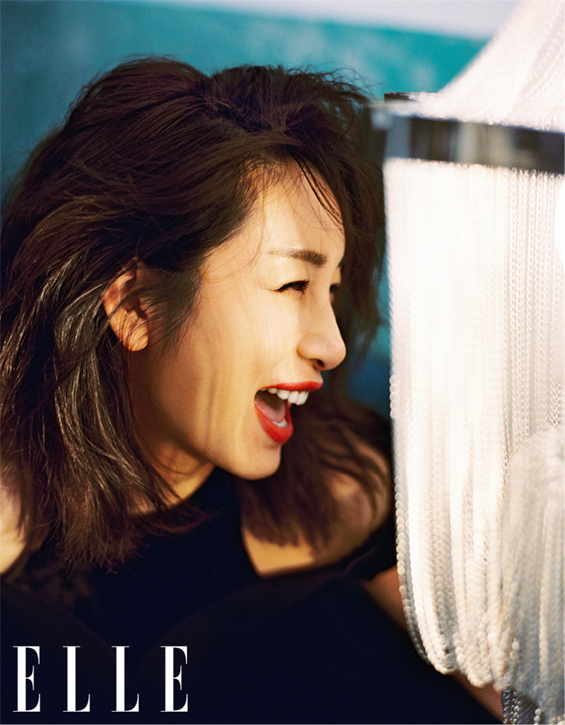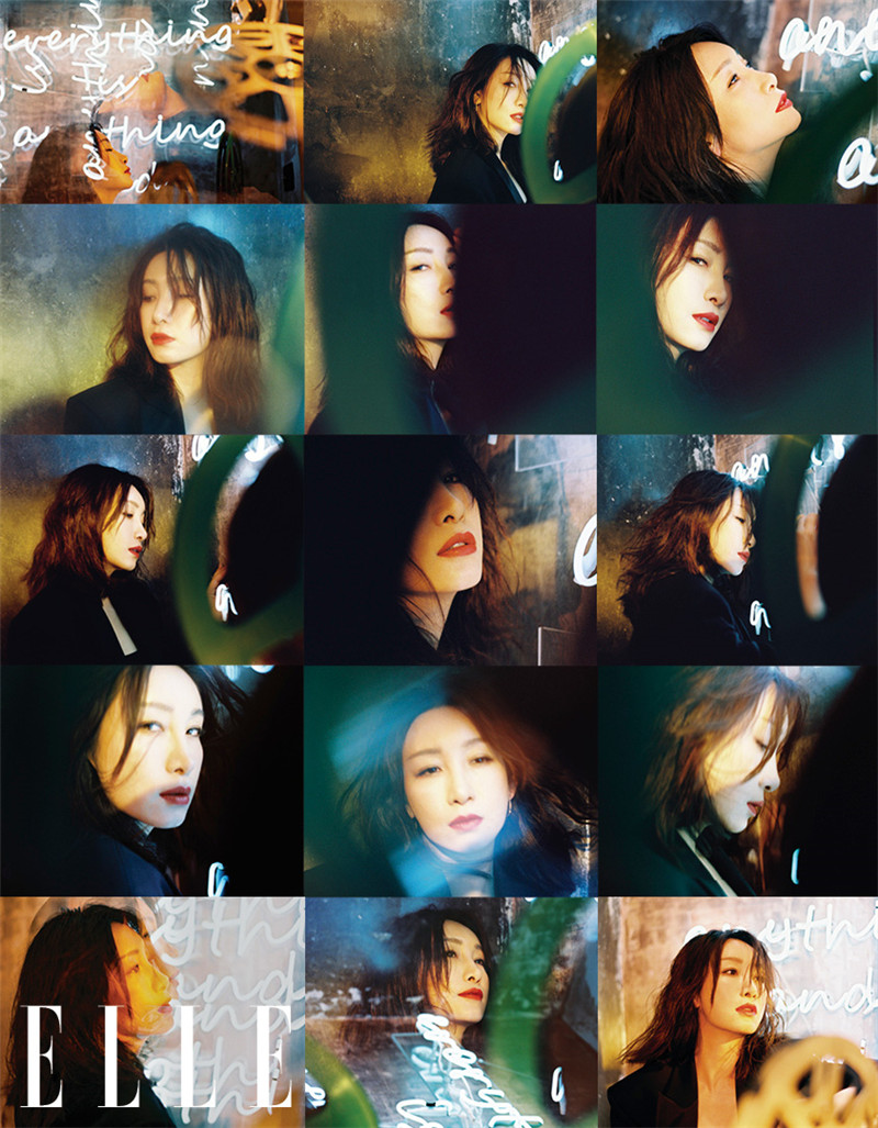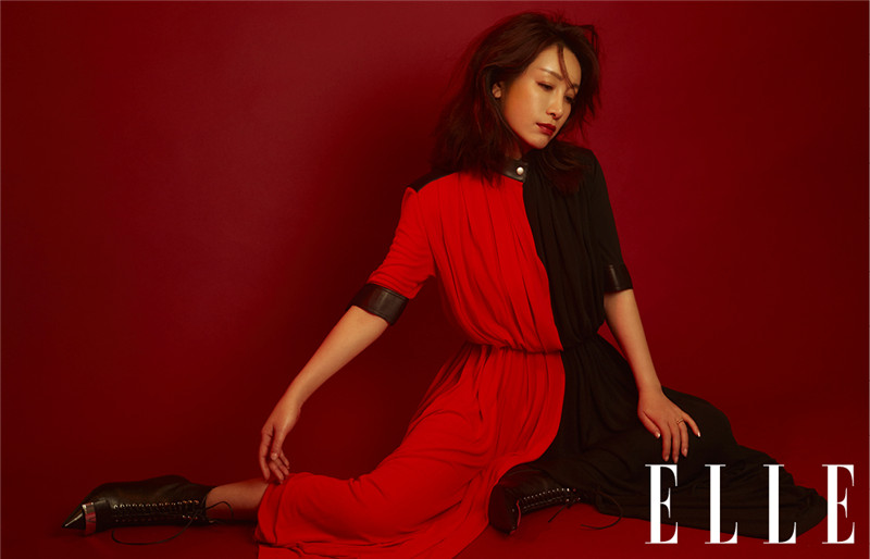 片中,秦海璐妆容精致,秀发微卷,或身着红黑拼色连体裤随性而坐,或以侧脸示人目视前方。