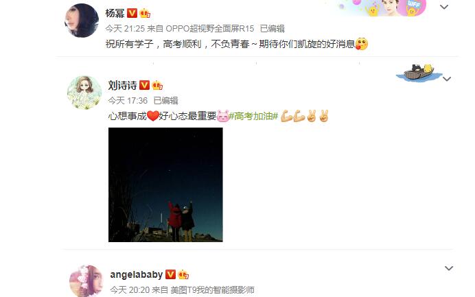 今天就要高考了,杨幂刘诗诗吴京等众星发博为高三学子加油打气。