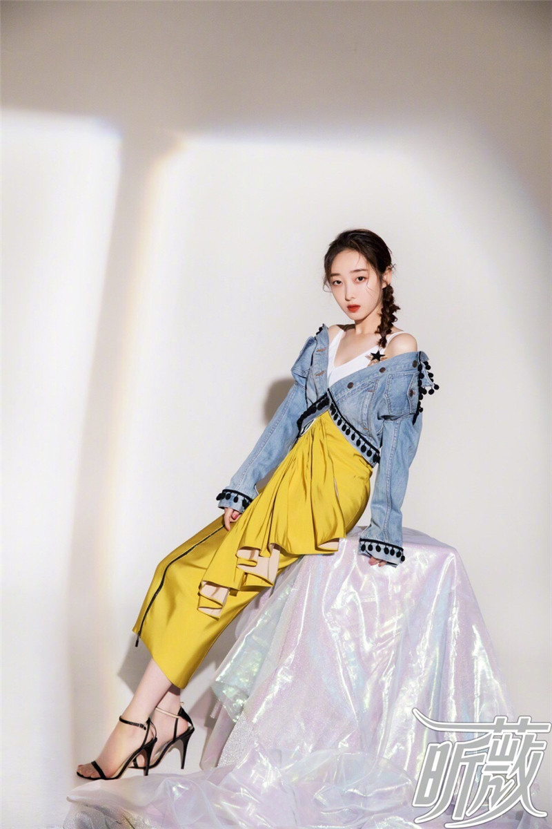 照片中,蒋梦婕妆容清爽,发型俏皮,白皙的肌肤配上色彩明亮的服饰,展现时尚表现力。