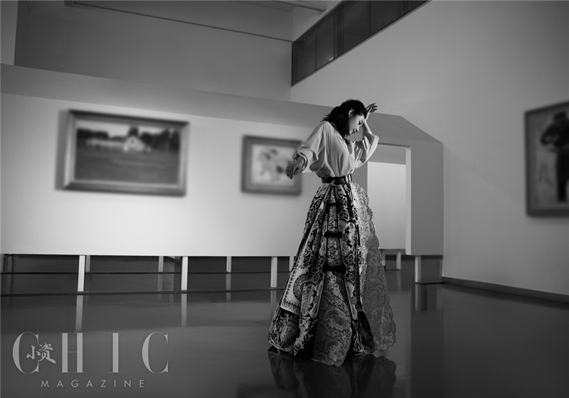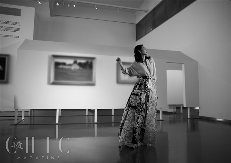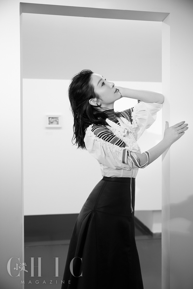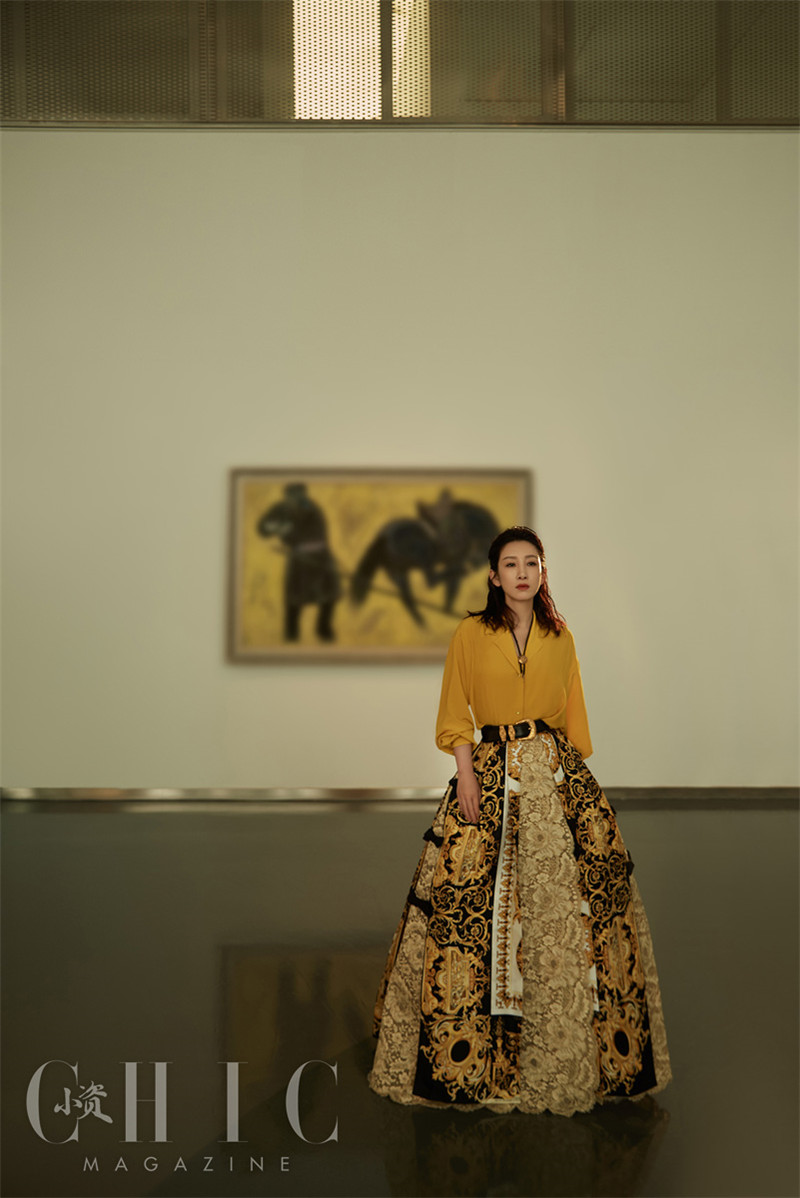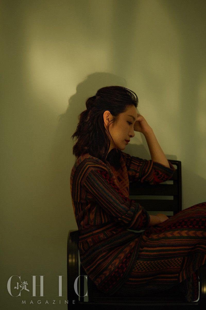 照片中,秦海璐或身着黄色衫搭配复古半裙,或以暖色条纹套装示人,随性坐在木制沙发上低头沉思,从容动人。