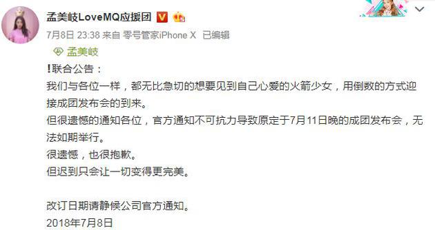 但很遗憾的通知各位,官方通知不可抗力导致原定于7月11日晚的成团发布会,无法如期举行。