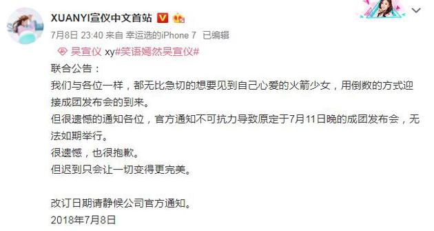 新浪娱乐讯 7月8日晚,火箭少女101各成员粉丝团发表联合公告,宣布原定于11日晚的成团发布会因不可抗力无法如期举行。内容如下: