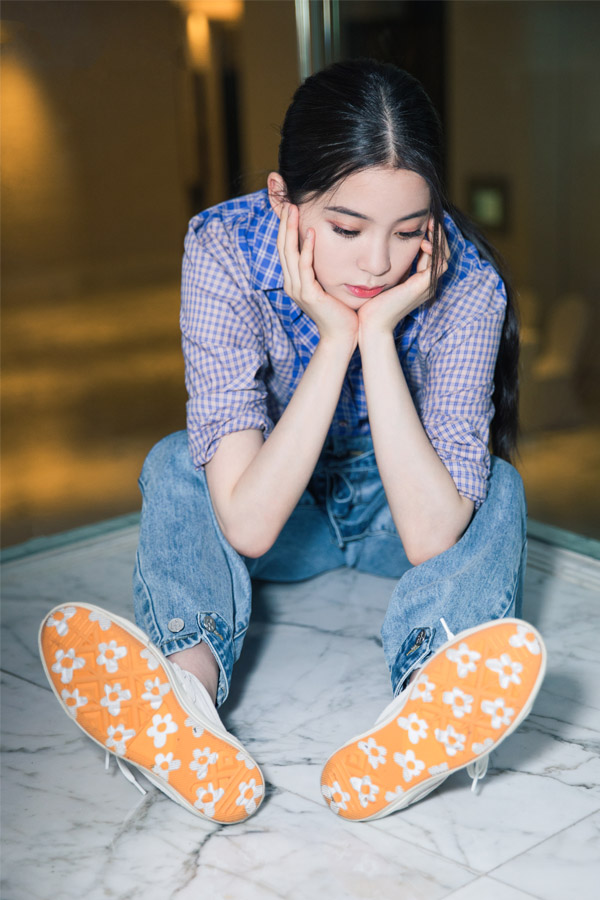 照片中欧阳娜娜身穿清新格纹衬衫搭配蓝色牛仔裤,鞋底小花点缀,细节之处尽显趣味可爱,展现酷少女的自我态度。