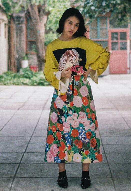 不管是明亮的黄色蝙蝠袖印花潮T搭配艳丽的花裙形成的色彩冲撞感,还是黑色翻领圆边斑点衬衣搭配黑色纱裙及黑漆皮平底鞋与短筒袜形成的复古摩登感。在这盛夏时分的街头,她无尽的活力和朝气如一缕微风拂来,打破了夏日因炎热而带来的沉闷气氛,增添了一抹清爽的气息。