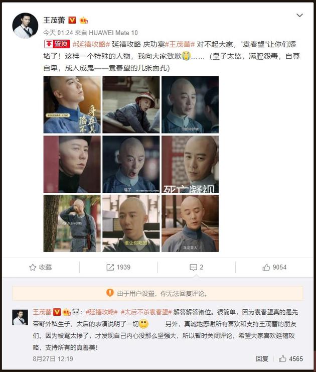 对此,王茂蕾在13个小时后再度发文:“真诚的感谢所有喜欢和支持王茂蕾的朋友们。因为被骂太惨了,才发现自己内心没那么坚强大,所以暂时关闭评论。”但他还是替戏迷解答疑惑,为什么太后不杀死袁春望,“很简单,因为袁春望真的是先帝野外私生子,太后的表演说明了一切。”