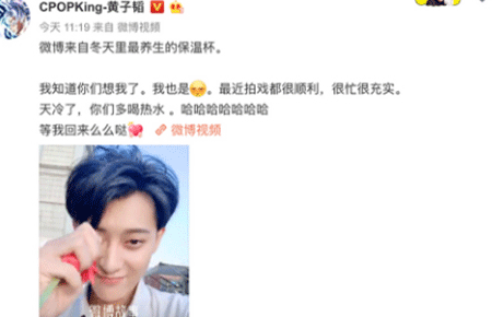 近日,领衔C-POP的超人气全能艺人黄子韬在个人社交平台晒出一段视频,配文表示“微博来自冬天里最养生的保温杯。 我知道你们想我了,我也是。最近拍戏都很顺利,很忙很充实。天冷了,你们多喝热水 。哈哈哈哈哈哈哈,等我回来么么哒!”在新剧拍摄期间不忘关心粉丝,可以说是超级宠粉了。而视频中黄子韬随音乐运镜,活力四射帅气十足。
