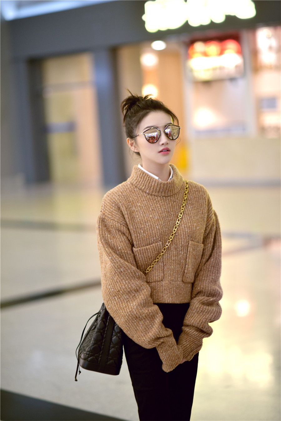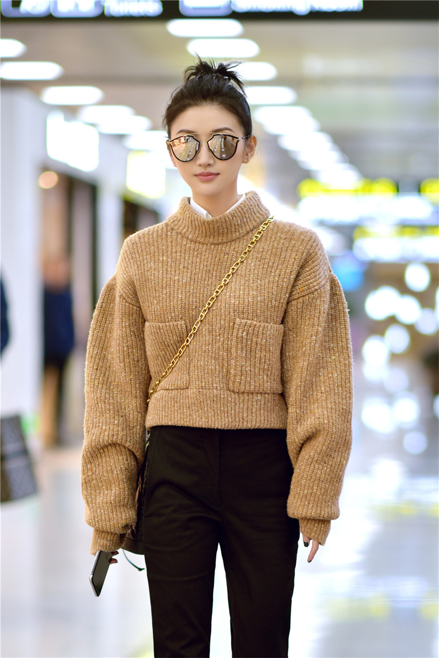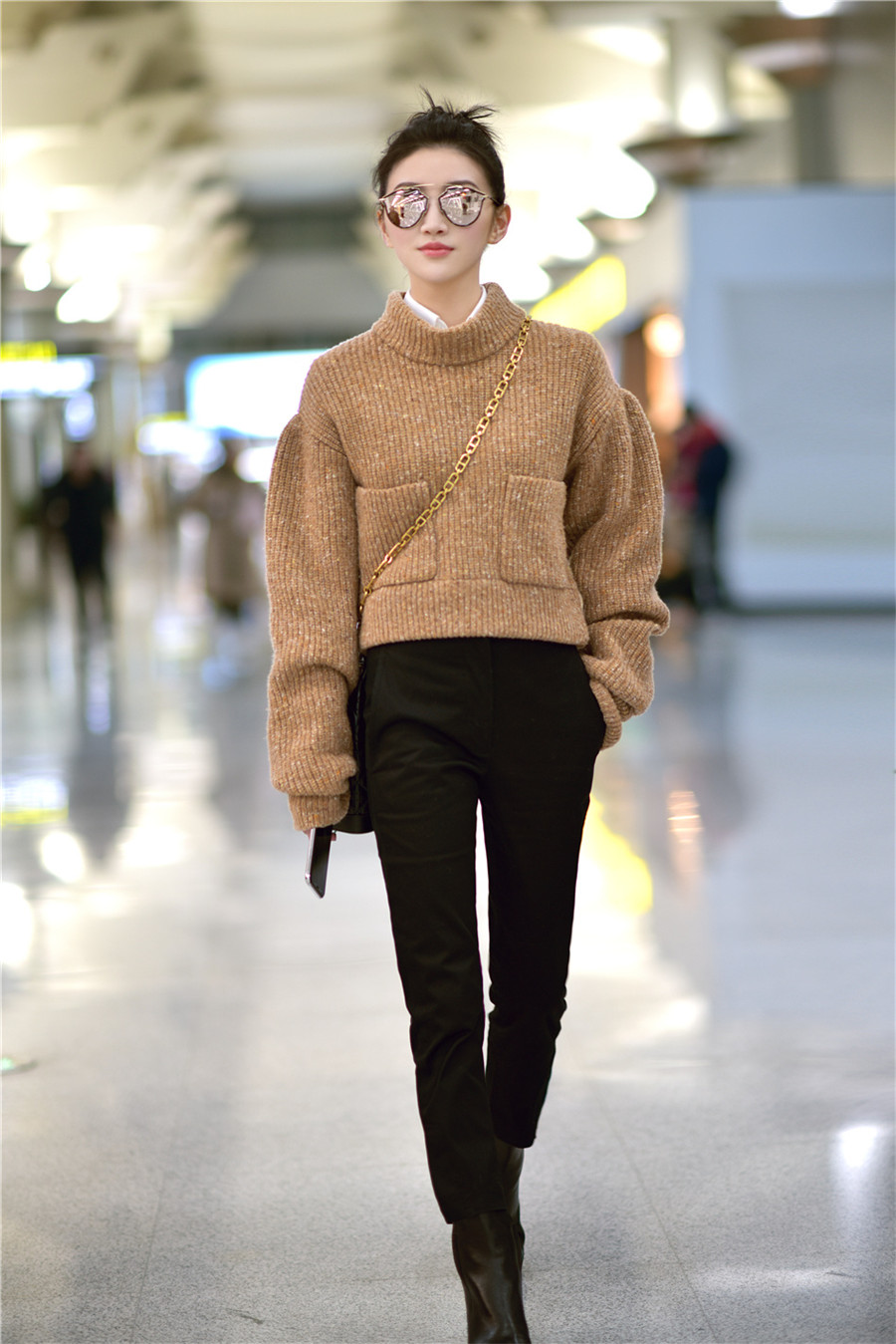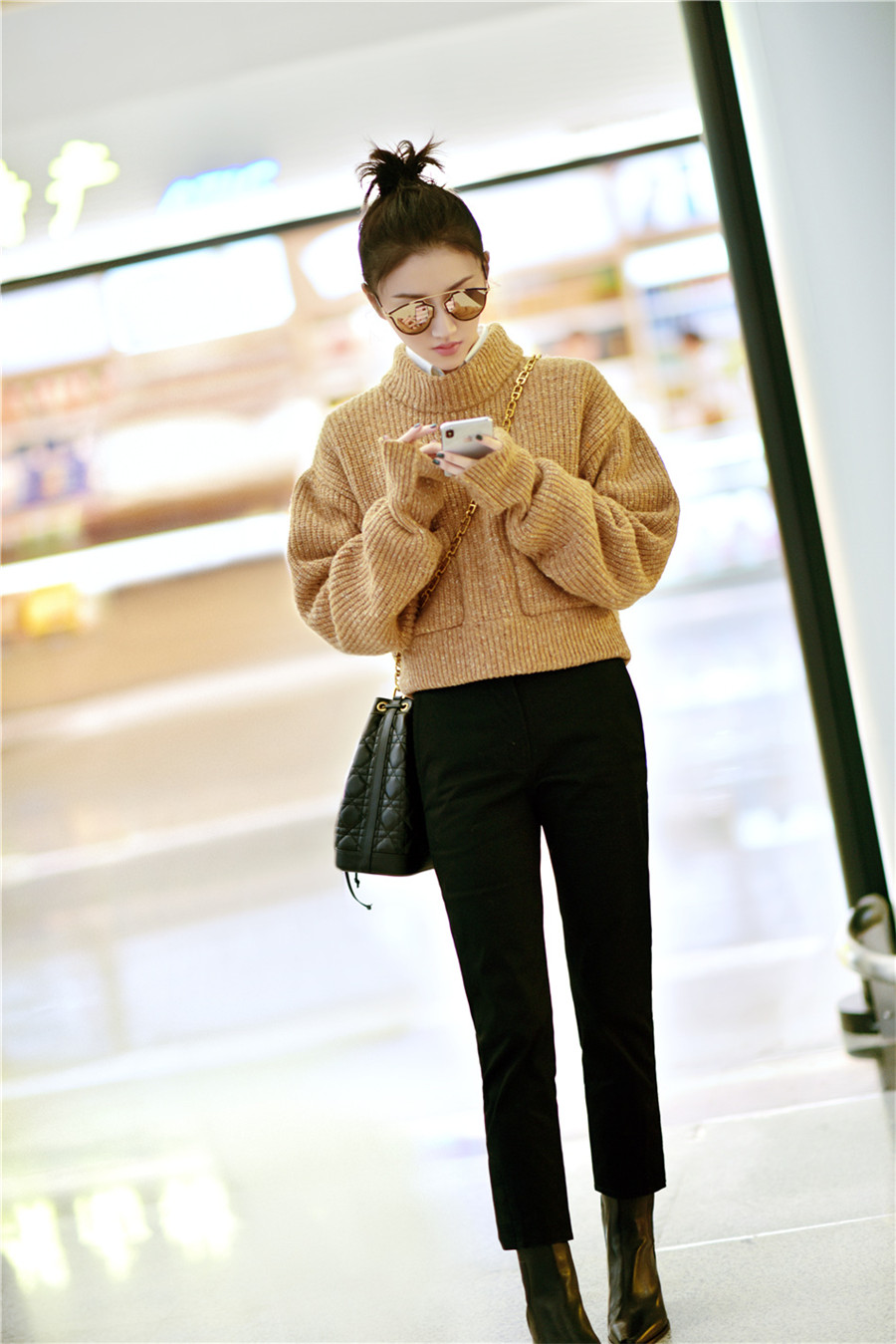 近日,景甜身着驼色短款毛衣现身机场。一双大长腿格外抢眼,丸子头造型搭配Dior墨镜和水桶包,精致有型,时髦又不失俏皮,整套look十足有范儿。网友们也纷纷表示:大甜甜又瘦啦!