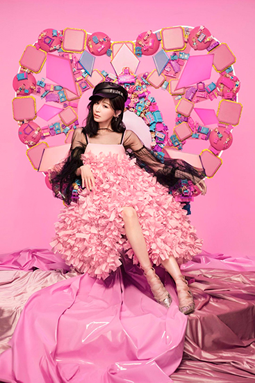 这套“粉爱妮”宣传照,王心凌专门赴北京与当地的团队合作拍摄。粉色代表她以往的甜美,造型蓬蓬裙来自设计师品牌ANNAKIKI,特别从米兰秀场空运到现场,不按牌理的和黑纱上衣结合,颠覆出一种态度感的甜美,搭配黑色皮革帽,在细节中感受到不同于以往的变化;而背后的华丽宝座,由可爱的二次元元素打造,彩色钻石和玩偶装饰拼组,象征可以是高贵女王也可以是俏皮公主!
