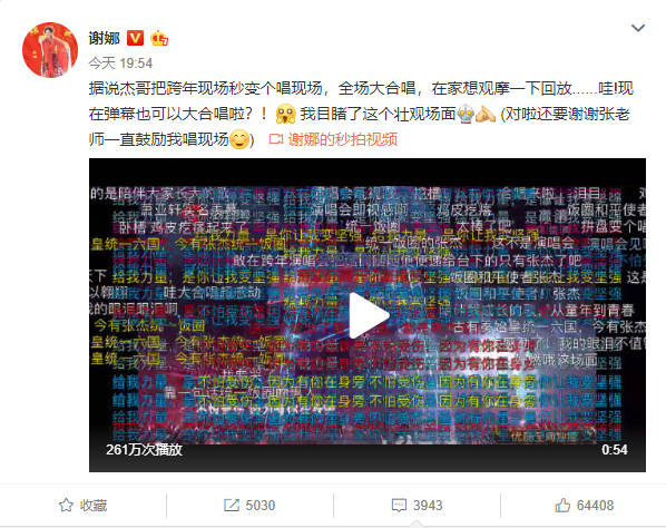 1月2日晚,谢娜通过微博和网友分享一段张杰在跨年晚会中演唱的视频,并称:“据说杰哥把跨年现场秒变个唱现场,全场大合唱,在家想观摩一下回放……哇!现在弹幕也可以大合唱啦?!我目睹了这个壮观场面。(对啦还要谢谢张老师一直鼓励我唱现场。)”
