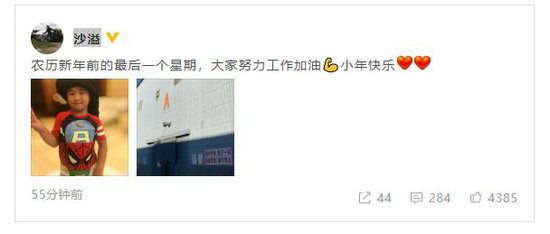 沙溢还配文祝福道:“农历新年前的最后一个星期,大家努力工作加油。小年快乐。”网友们也纷纷留言祝福:“小年快乐!”“小鱼儿太可爱啦~!”