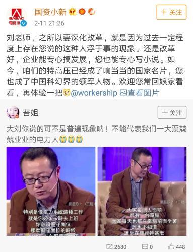中新网客户端2月12日电(袁秀月)近日,电影《流浪地球》大火,作家刘慈欣早前的一段采访也被网友翻出。他说,像电力系统这种工作,必须按时去上班,坚守岗位。在坚守岗位的时候,就可以在那里写作了。对此,国资委新闻中心微博@国资小新 评论道,“之所以要深化改革,就是因为过去一定程度上存在这种人浮于事的现象。还是改革好,企业能专心搞发展,您也能专心写小说”。而刘慈欣在接受媒体采访时则表示,工作时间是没时间写作的,每天的活都不断。