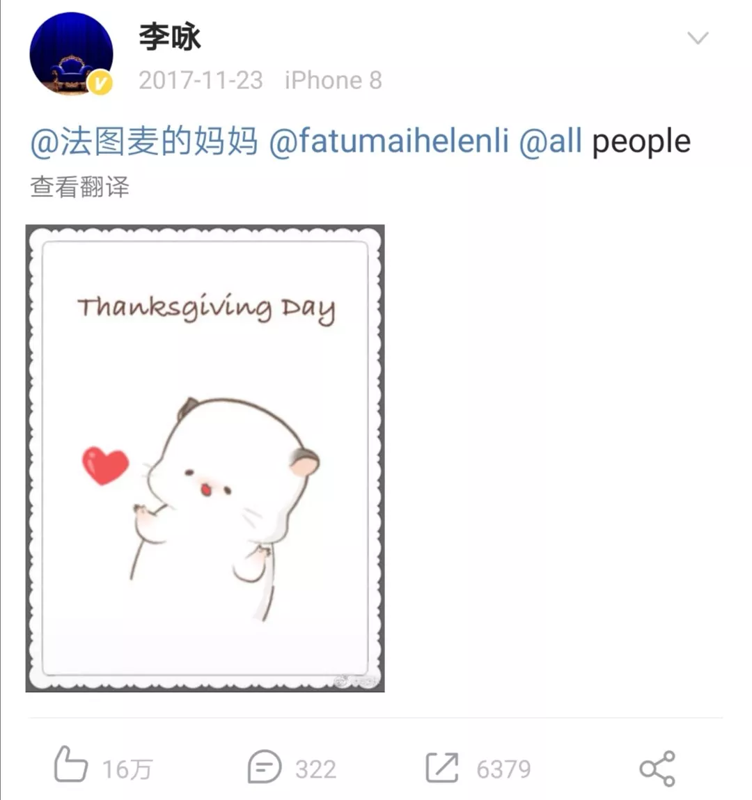 他的微博,停留在2017年的感恩节,他发了一张“Thanksgiving Day”图,艾特了妻子和女儿,又感谢了所有人,他一直喜欢用这个可爱的表情包与她们交流。