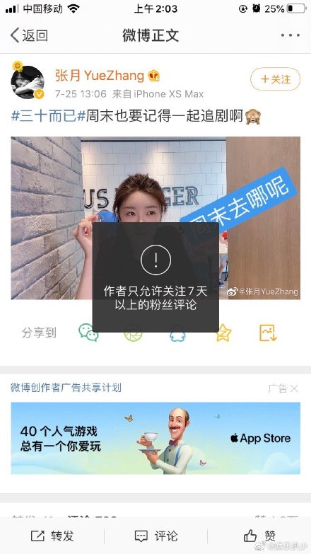 近日,张月的微博评论区已经沦陷,而她最后一条微博是25号发的。此前,在剧集播出期间张月天天都会营业,但如今她已经多天没更博,而且还只允许关注7天以上的粉丝评论。