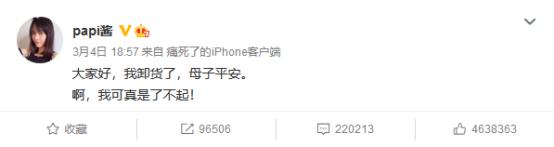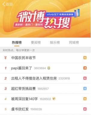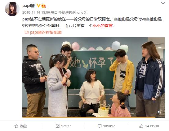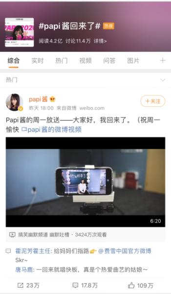9月7日晚18:00,因怀孕生娃沉寂7个多月的@papi酱 在微博发布了自己最新的短视频,正式宣布复出,该条短视频2小时观看量超过1000万,迅速引发网友围观,登上微博热搜榜首位。